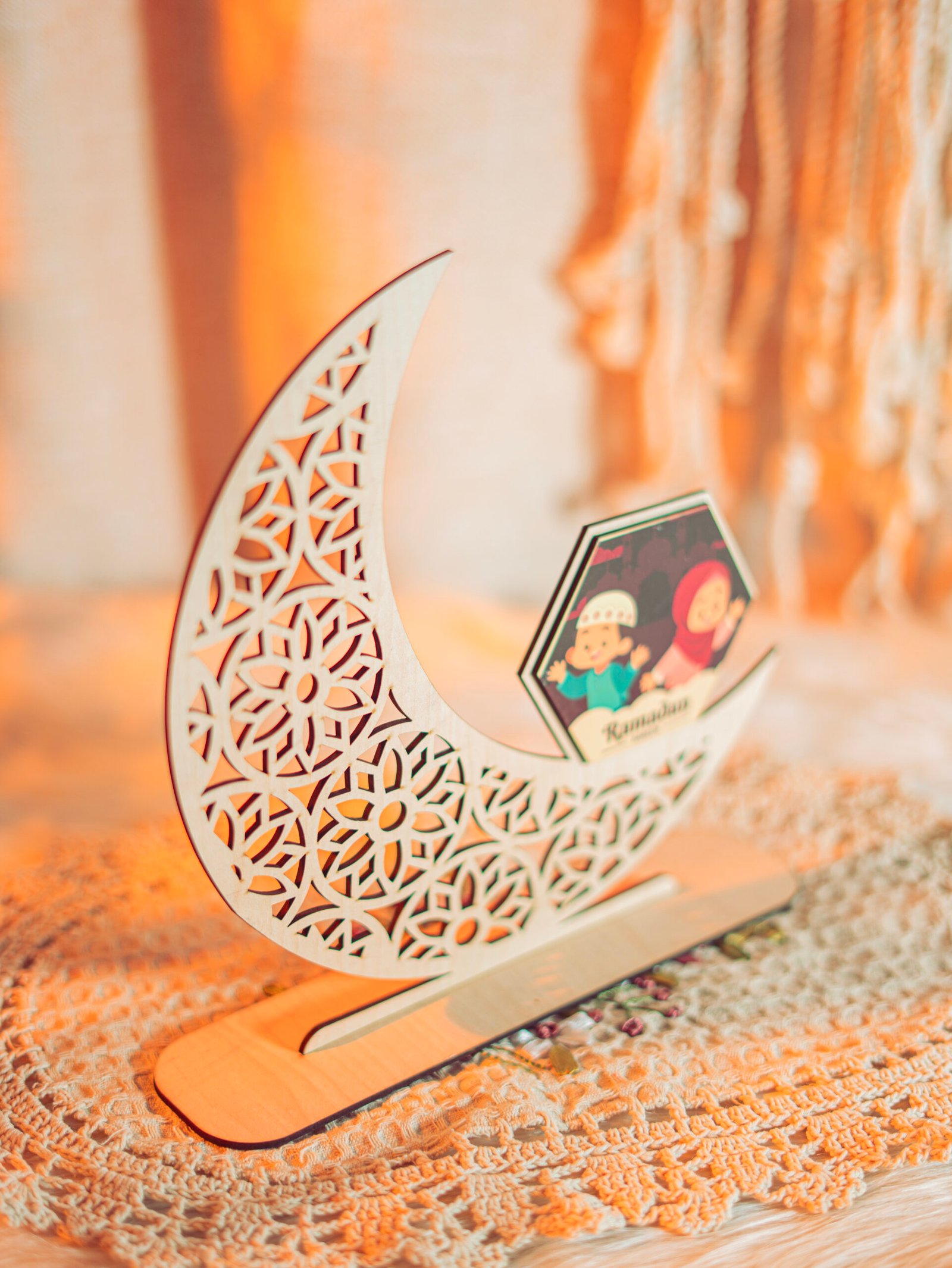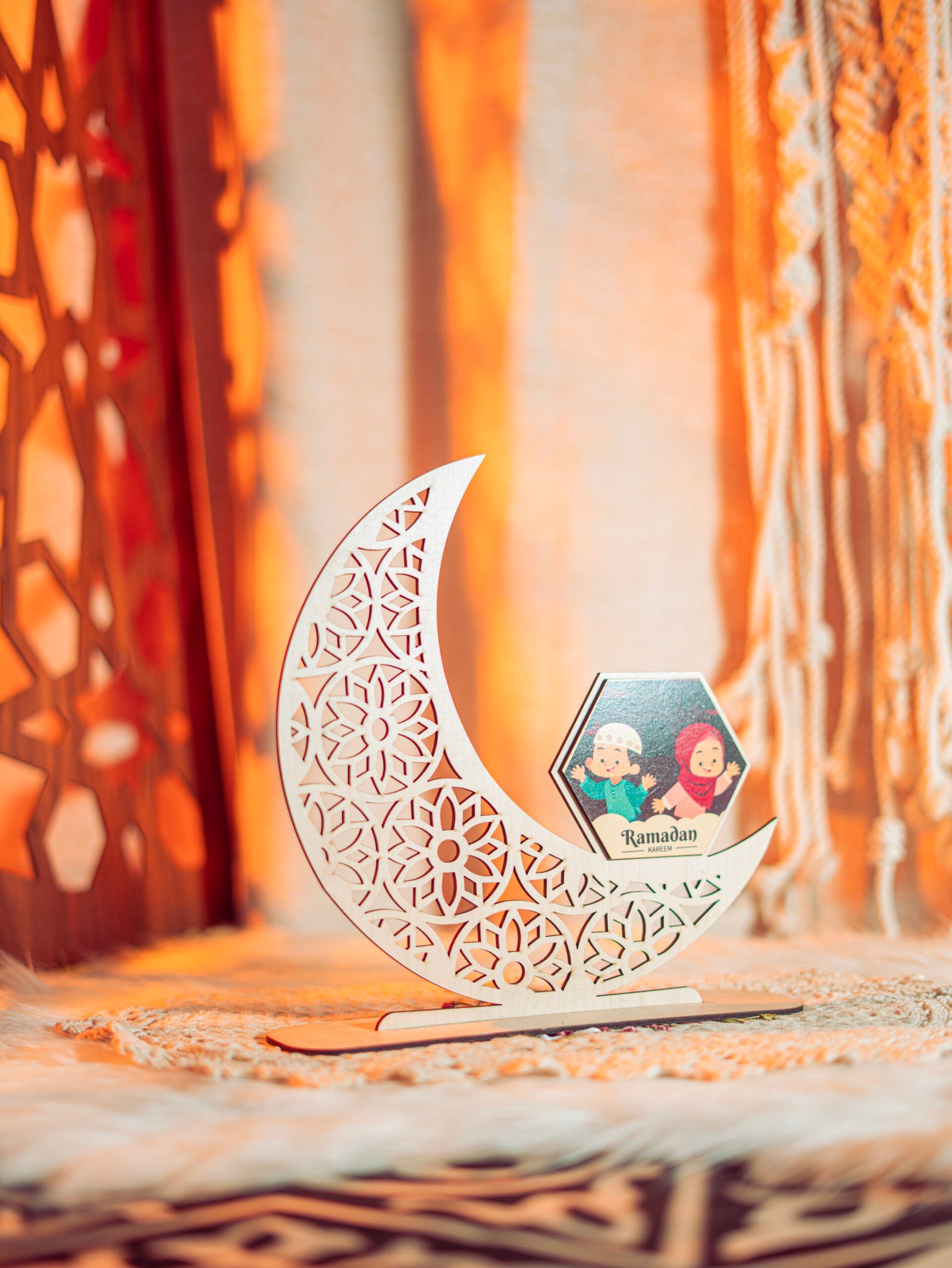 “اجعل رمضان مميز وفريد مع هذا الهلال الخشبي، مع إمكانية وضع صورة طفلك لتضيف لمسة دافئة وفريدة لديكورك.”