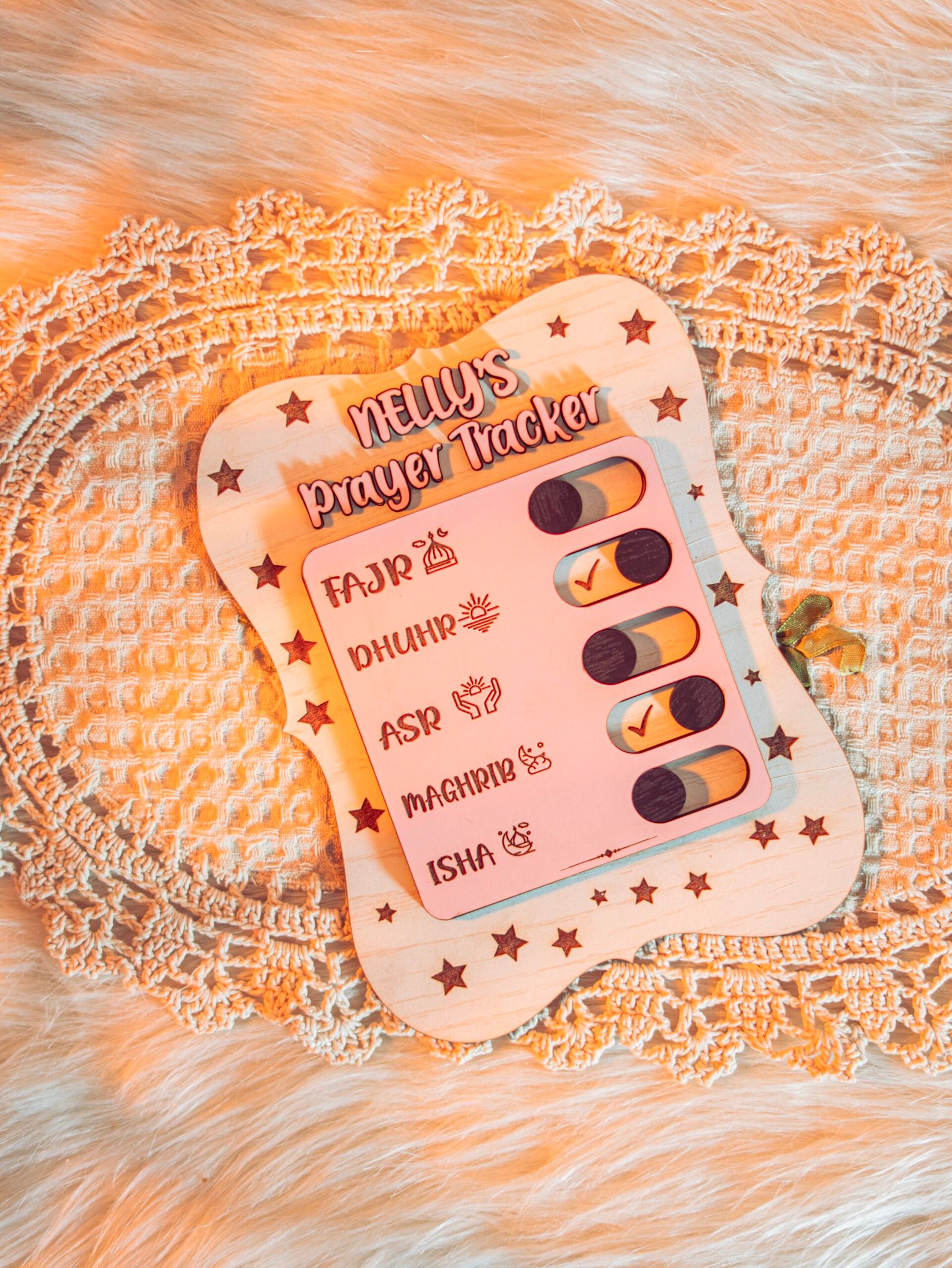 Stay consistent with your daily prayers using this elegant tracker stand, designed to gently remind and motivate you to complete each prayer every day.”