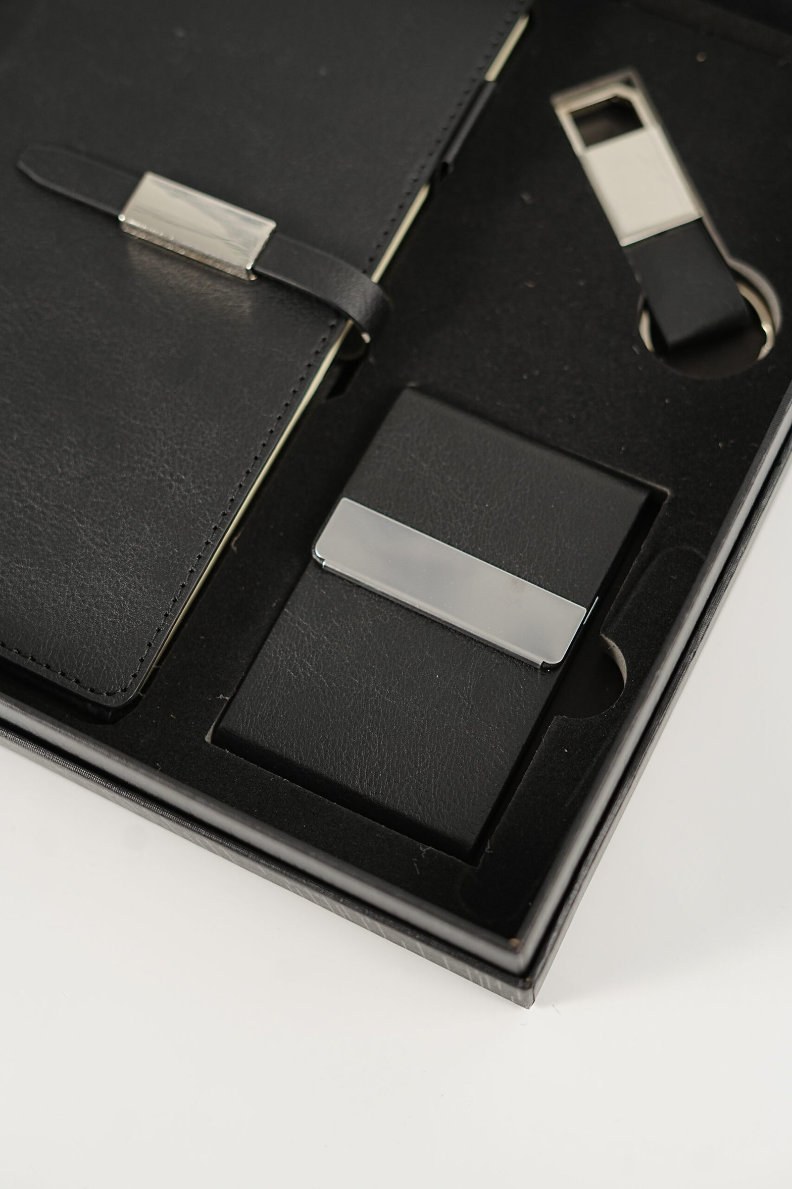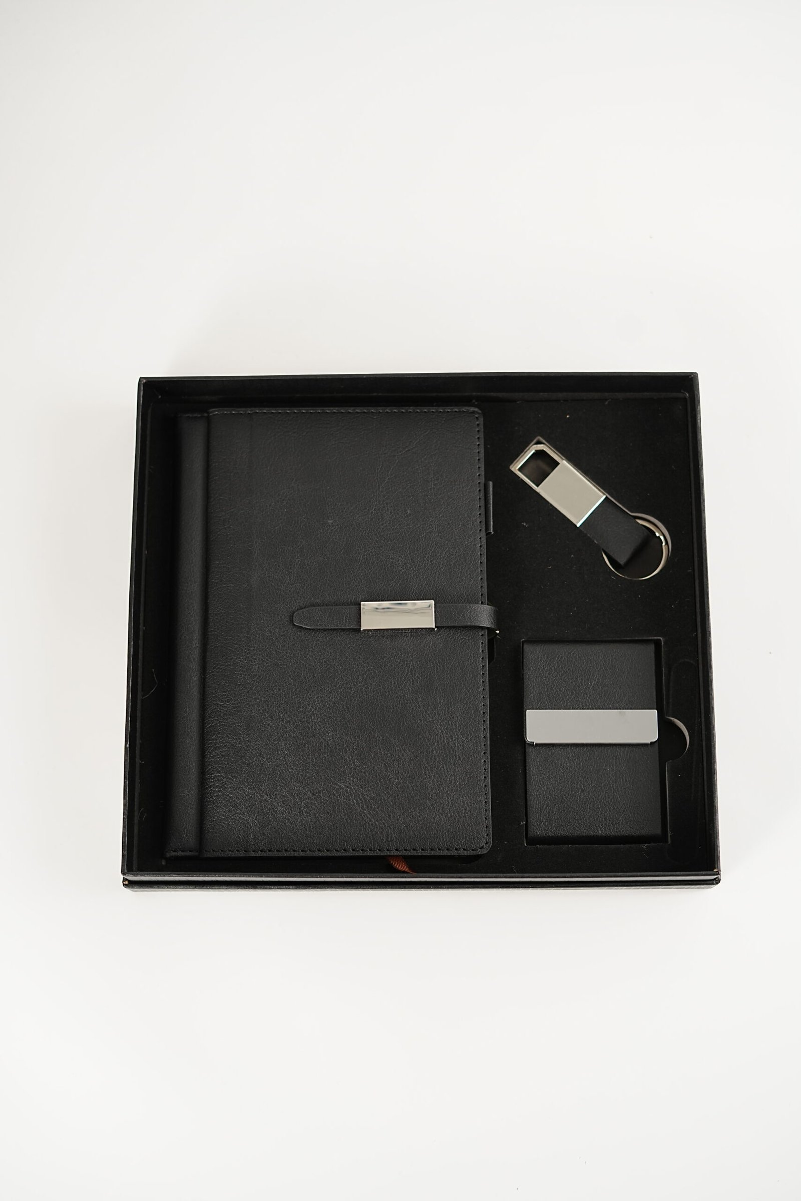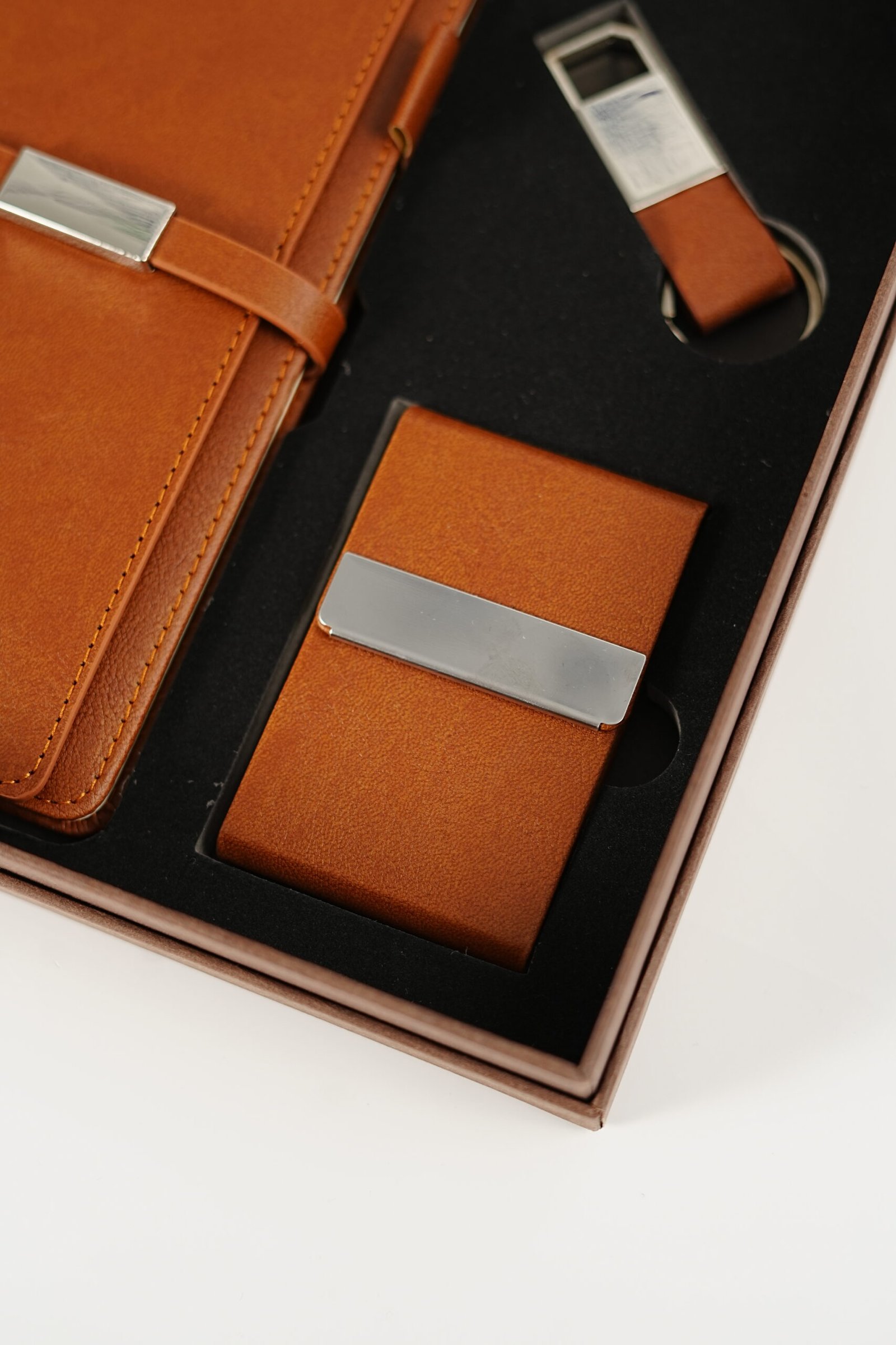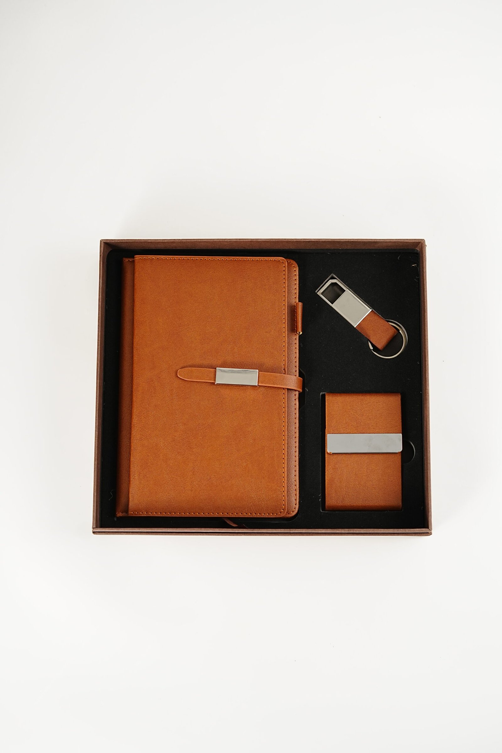 A luxurious leather gift set featuring a stylish notebook, sleek card holder, and elegant keychain — crafted with premium quality for a professional, timeless touch. Perfect for New Year 2026 gifting.
