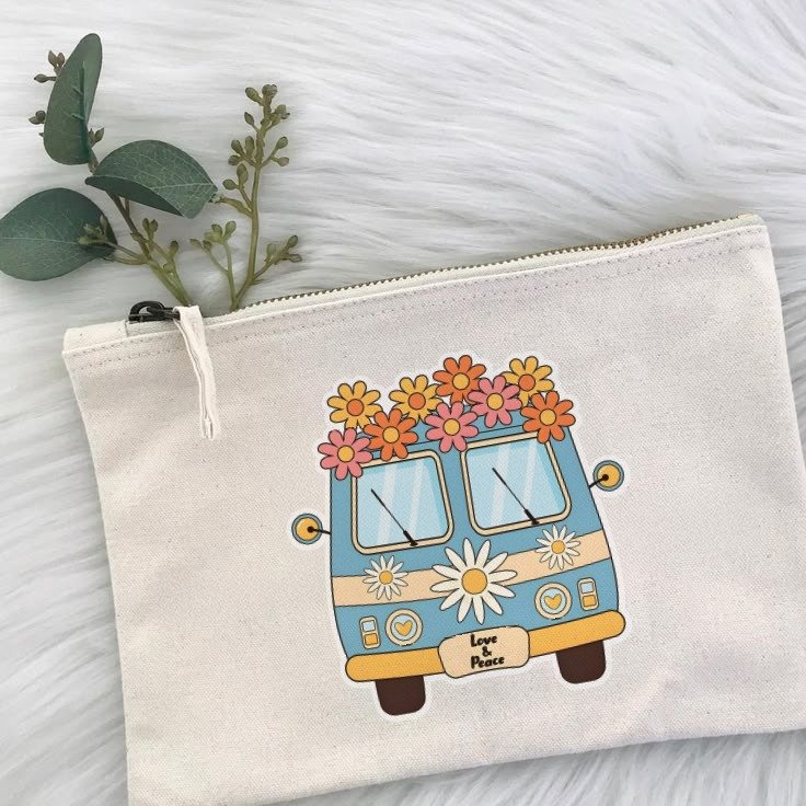“Spread good vibes everywhere — boho-style canvas pouch with a ‘Love & Peace’ retro van design!